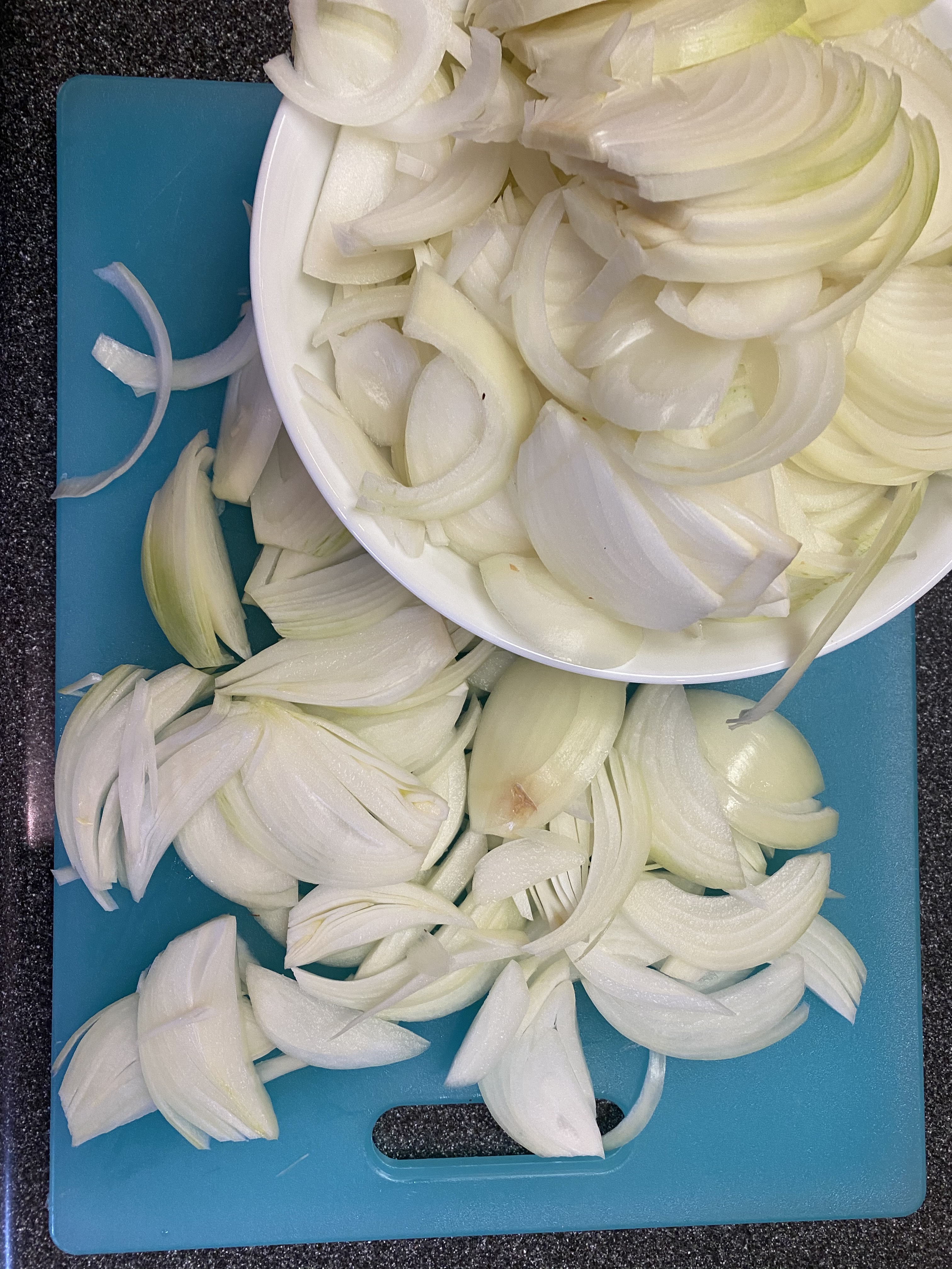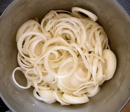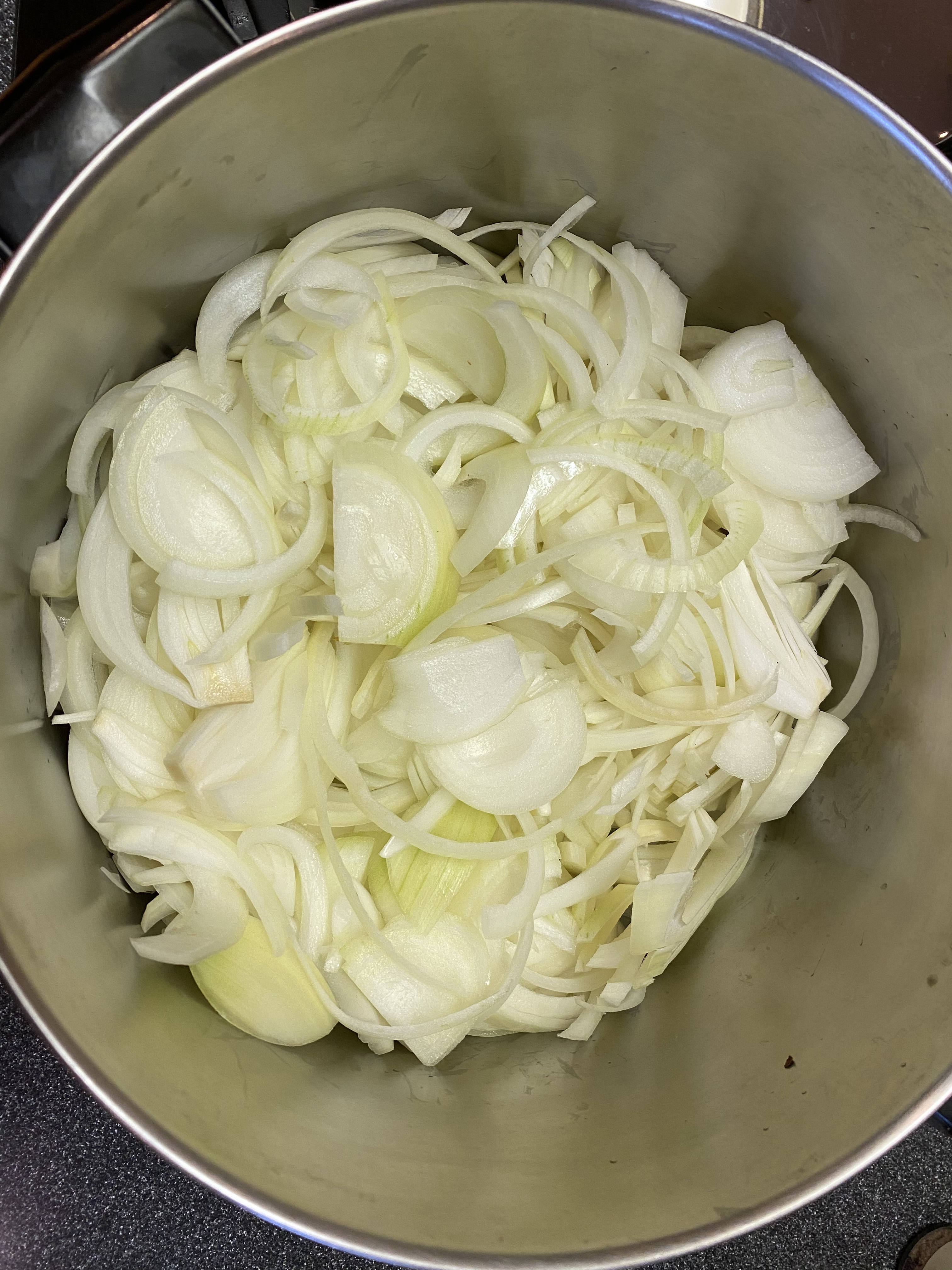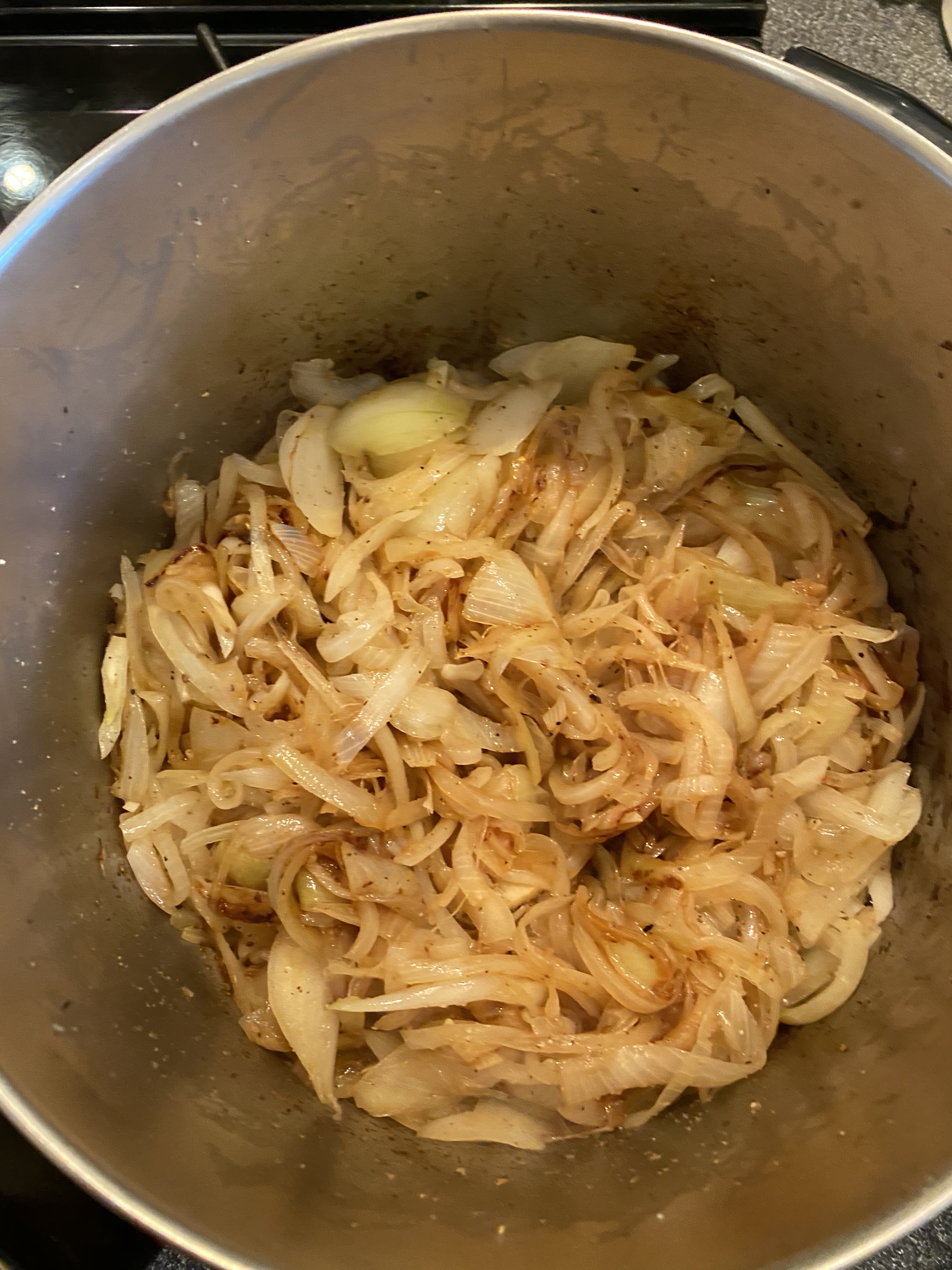 2. After 10 minutes stir, turn heat to low and cover for 20 minutes. Onions should be beginning to carmelize.