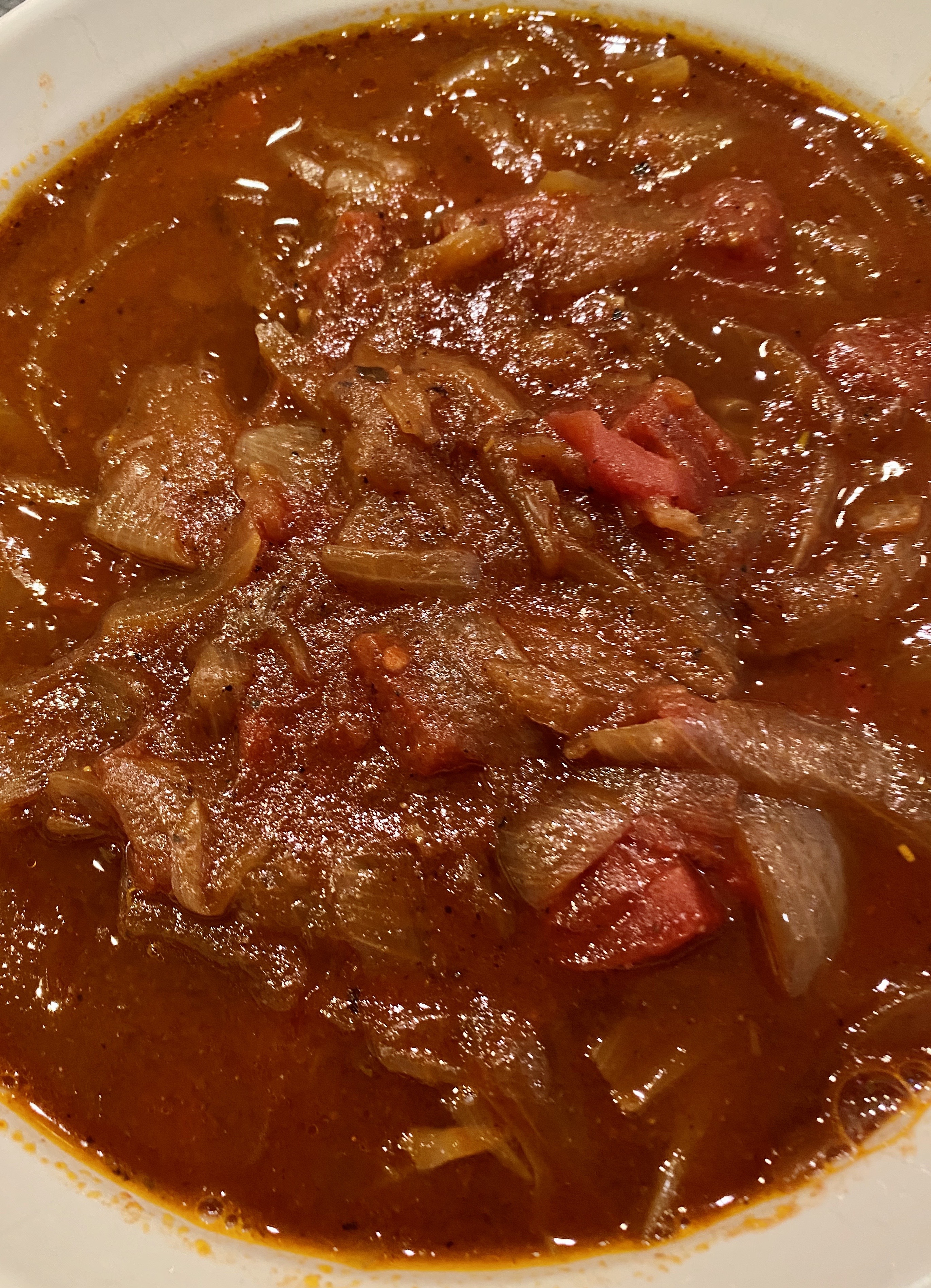 Here’s a great tomato-onion soup dish I made this afternoon after having a wonderful similar soup last week at Biba’s Ristorante in Sacramento! This takes some time but doesn’t require constant attention – ideal for a lazy afternoon where you might be reading or working on other things as well!