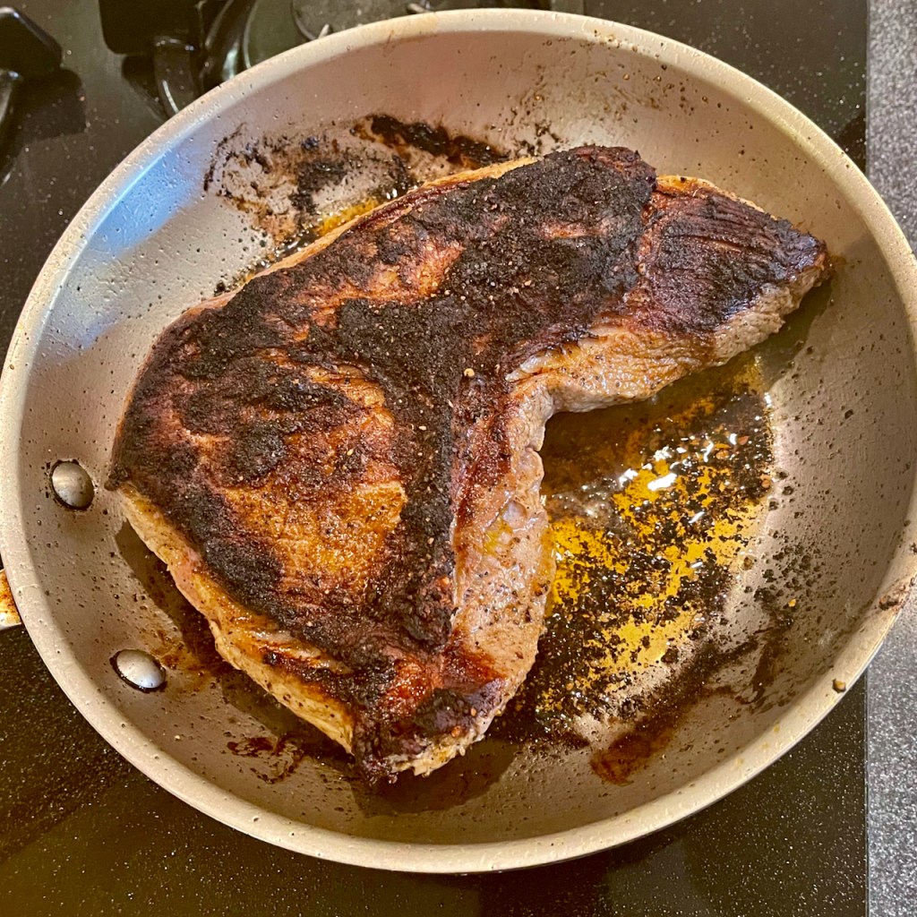 To cook the steak, I like to use the 3-3-2-2 method popularized by Rob Leavitt. Heat the pan using medium-high heat. Cook the steak 3 minutes on the first side, then flip and cook 3 minutes on the other side. Then flip again to cook for 2 minutes and a final flip to cook for 2 minutes. Check the steak with a meat thermometer to be sure it’s at your desired doneness level – then remove it from the pan to a cutting board and let rest for 5 minutes. You can then either cut the steak into two pieces – or – slice it and serve all of the slices communally on a plate.