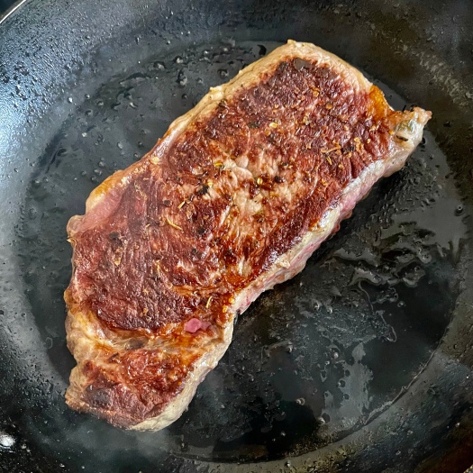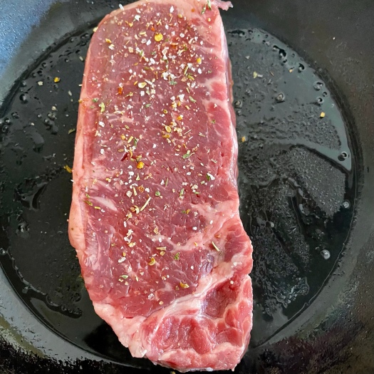 We usually buy a 1 lb New York steak which we will split into two portions. It’s important to take the steak out of the refrigerator 30 minutes before cooking to let it come up to room temperature. Here’s a NY steak – seasoned and resting to warm up a bit: