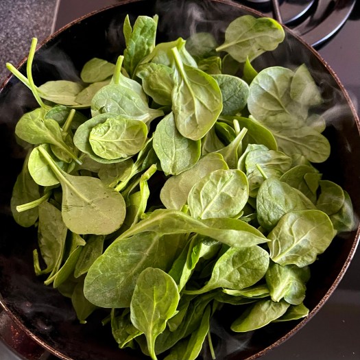 Sautéed spinach is easy: in a large skillet heat a bit of olive oil and then toss in the spinach. We typically use a half of one of the large baby spinach containers for dinner for two. While the spinach is sautéing, add in a touch of minced garlic and a splash of lemon juice. I usually start the spinach sautéing a minute or two after firing the steak.
