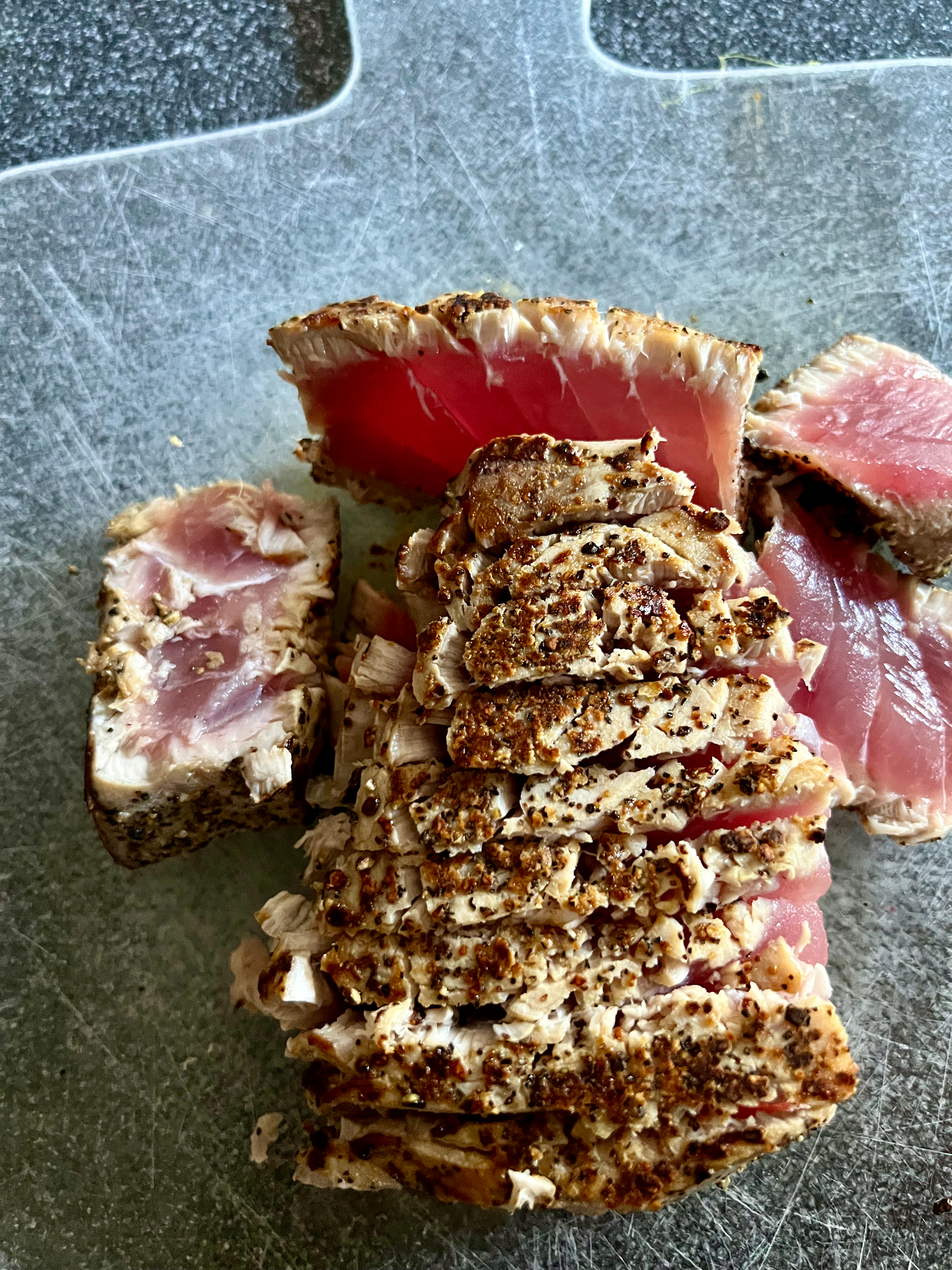 The fish monger at our local Sunday morning farmers market has been carrying fresh ahi tuna. We always enjoy fresh tuna for a delightful light Sunday supper that’s quick and easy to prepare. We’ve been enjoying the tuna with a simple wasabi vinaigrette dressing. Be sure you buy only the freshest high-quality tuna as this recipe only lightly pan-sears it.