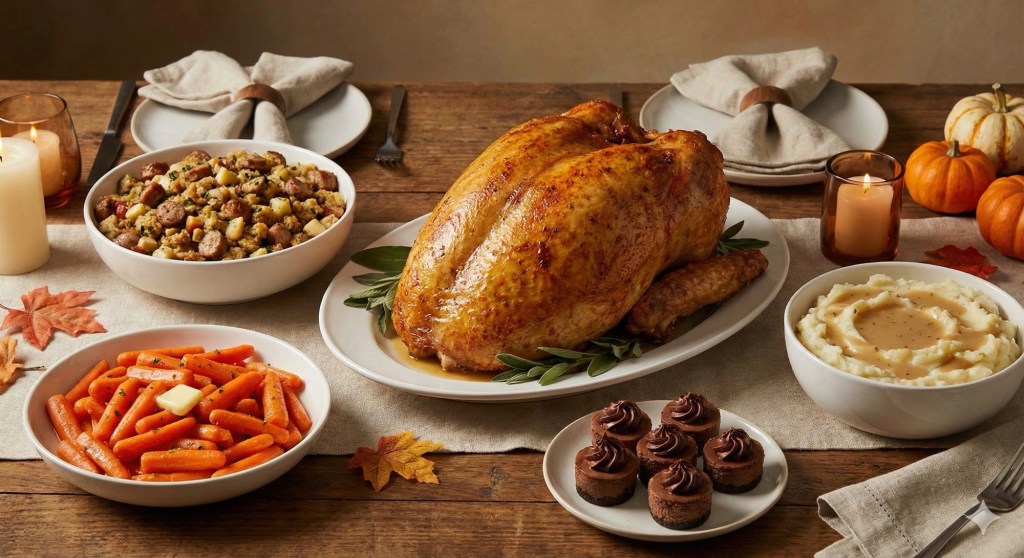• Dessert: For dessert we had a box of frozen chocolate cheesecake bits from Trader Joe’s which we just right – small but flavorful way to end the otherwise big meal! See: https://www.traderjoes.com/home/products/pdp/chocolate-cheesecake-bites-077104